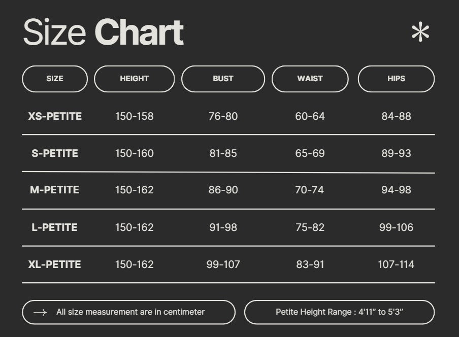 • Sizes: XS-Petite to XL-Petite — proportioned carefully for petite height and petite sleeve length.